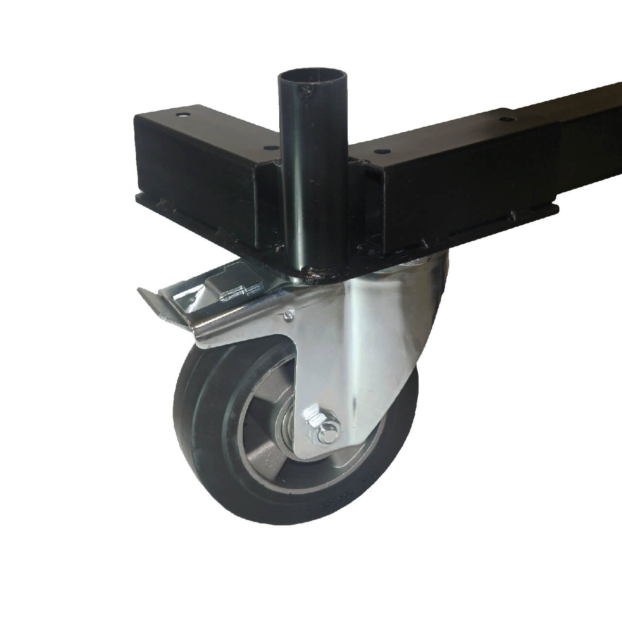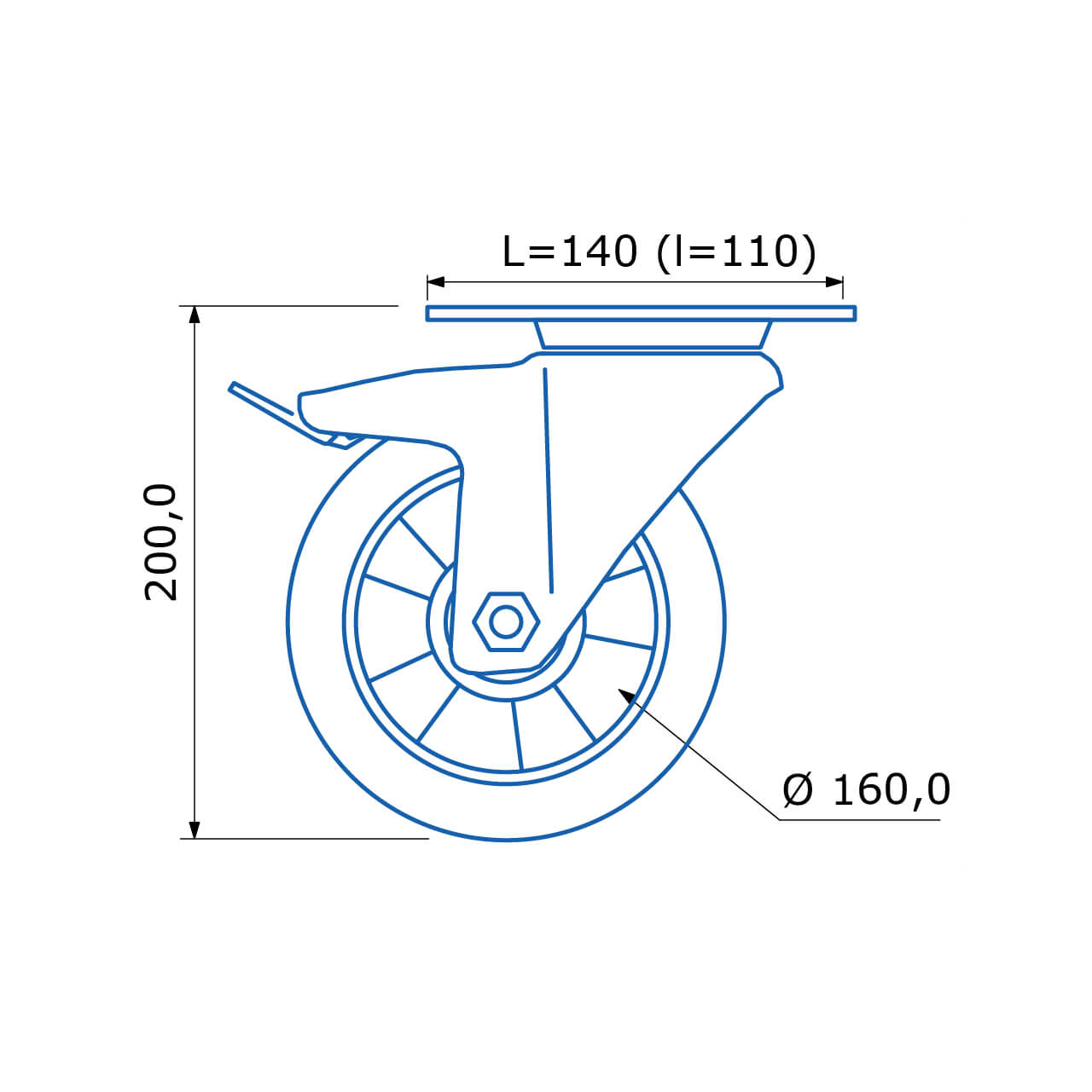 Top plate castor for heavy loadings. Swivel castor function with foot brake. Wheel diameter: 160 mm. Mounted with four S7 screws.